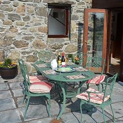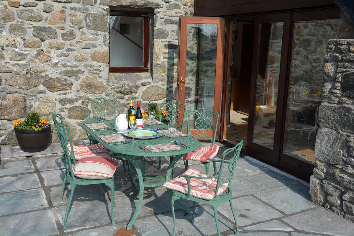 Acha Mill is surrounded by garden with a small stream, along with a large patio area.