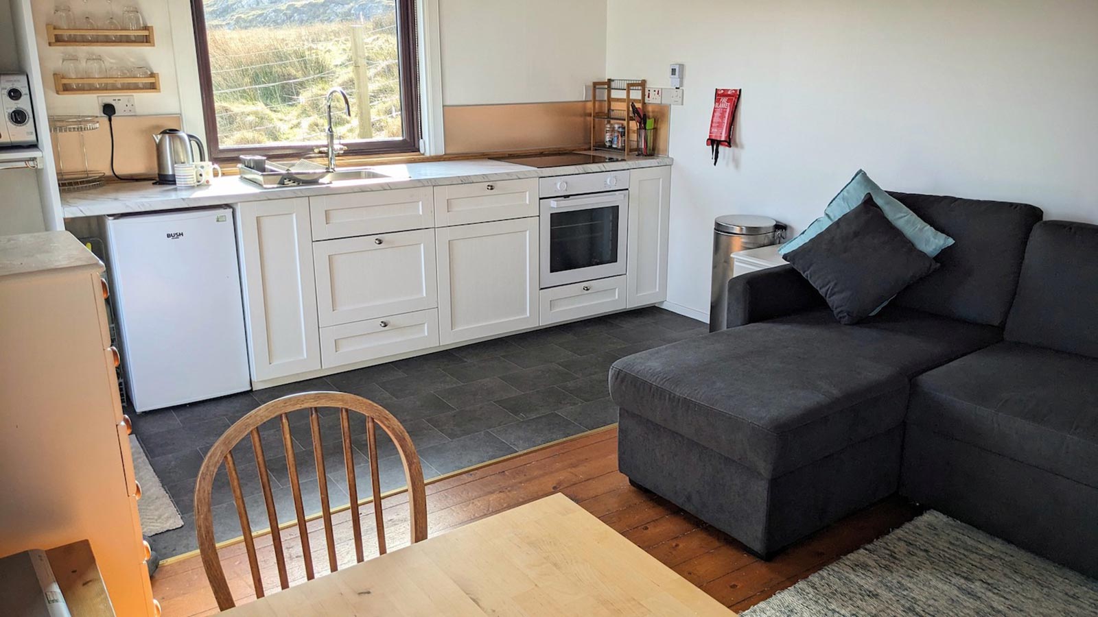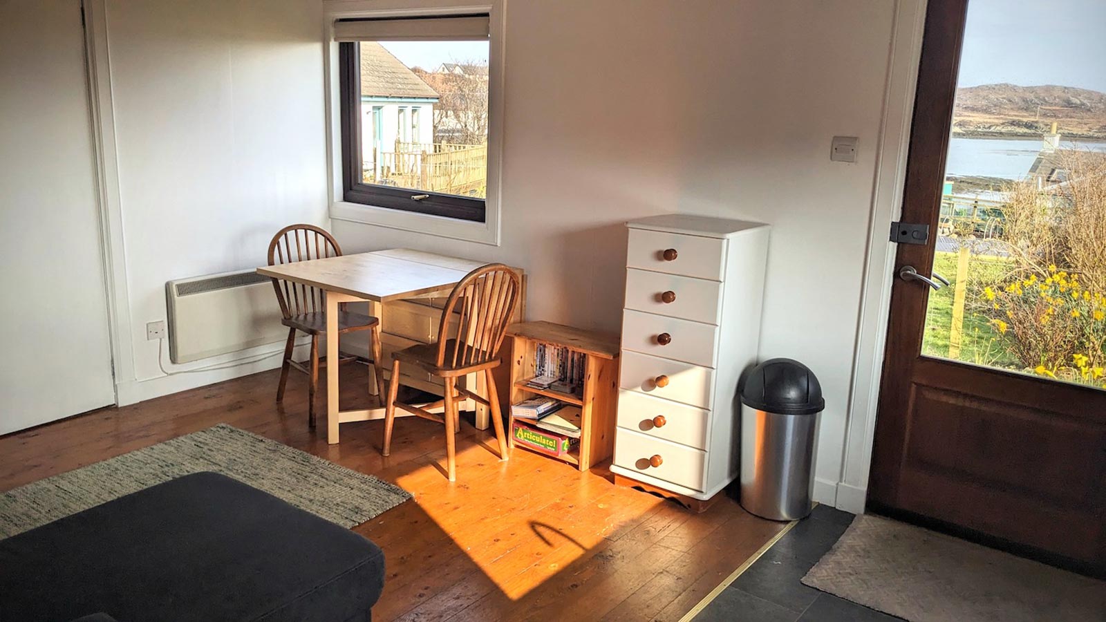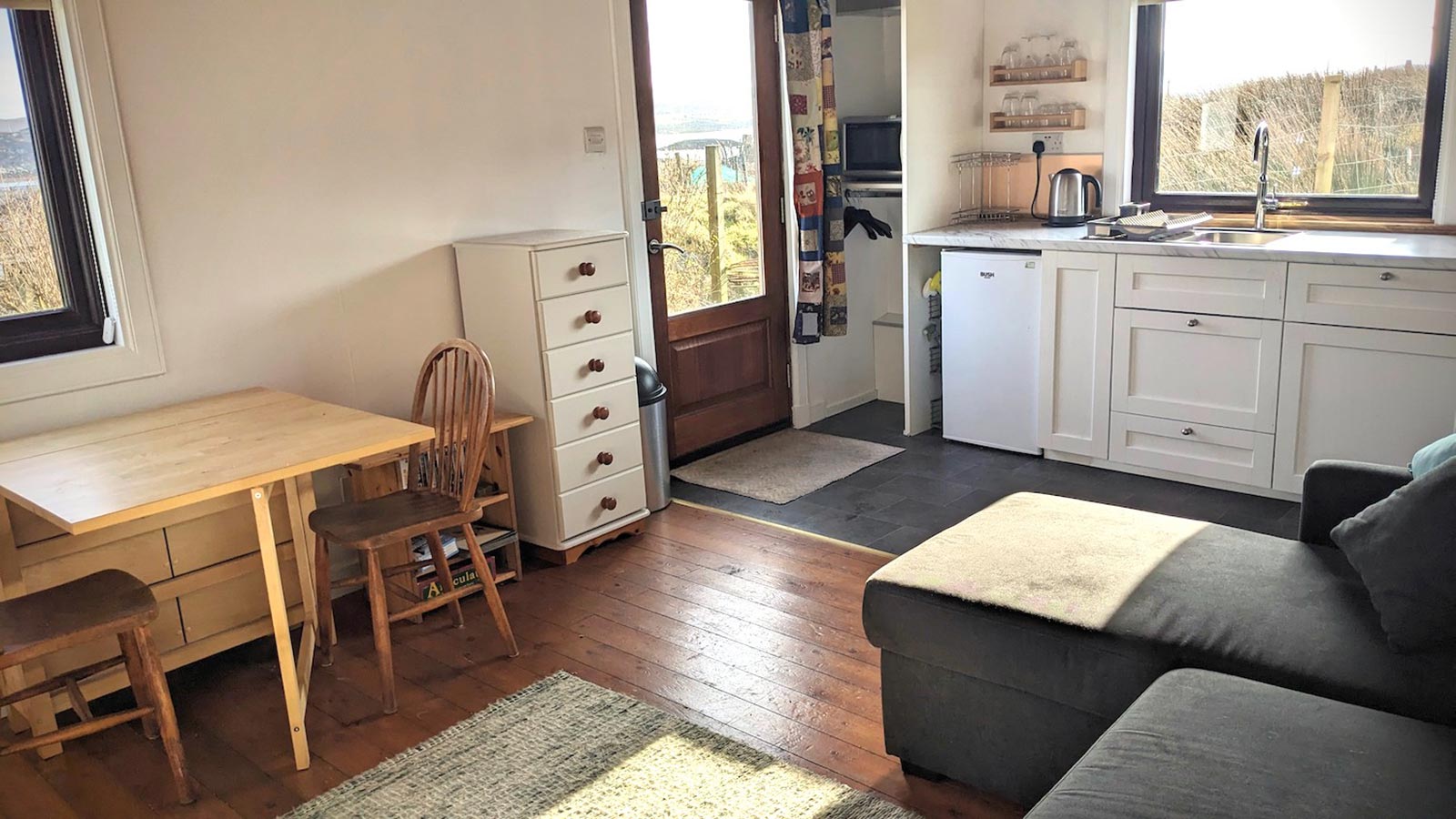 Situated behind the traditional terraced cottages in Arinagour, this newly refurbished cabin is in an ideal spot for anyone who wants to stay close to everything that the village has to offer, and for those who are travelling to Coll without a car. It’s a short walk from the cabin to the local shop, Post Office, An Cridhe (the island’s community centre), the island cafe, and the hotel/bar.