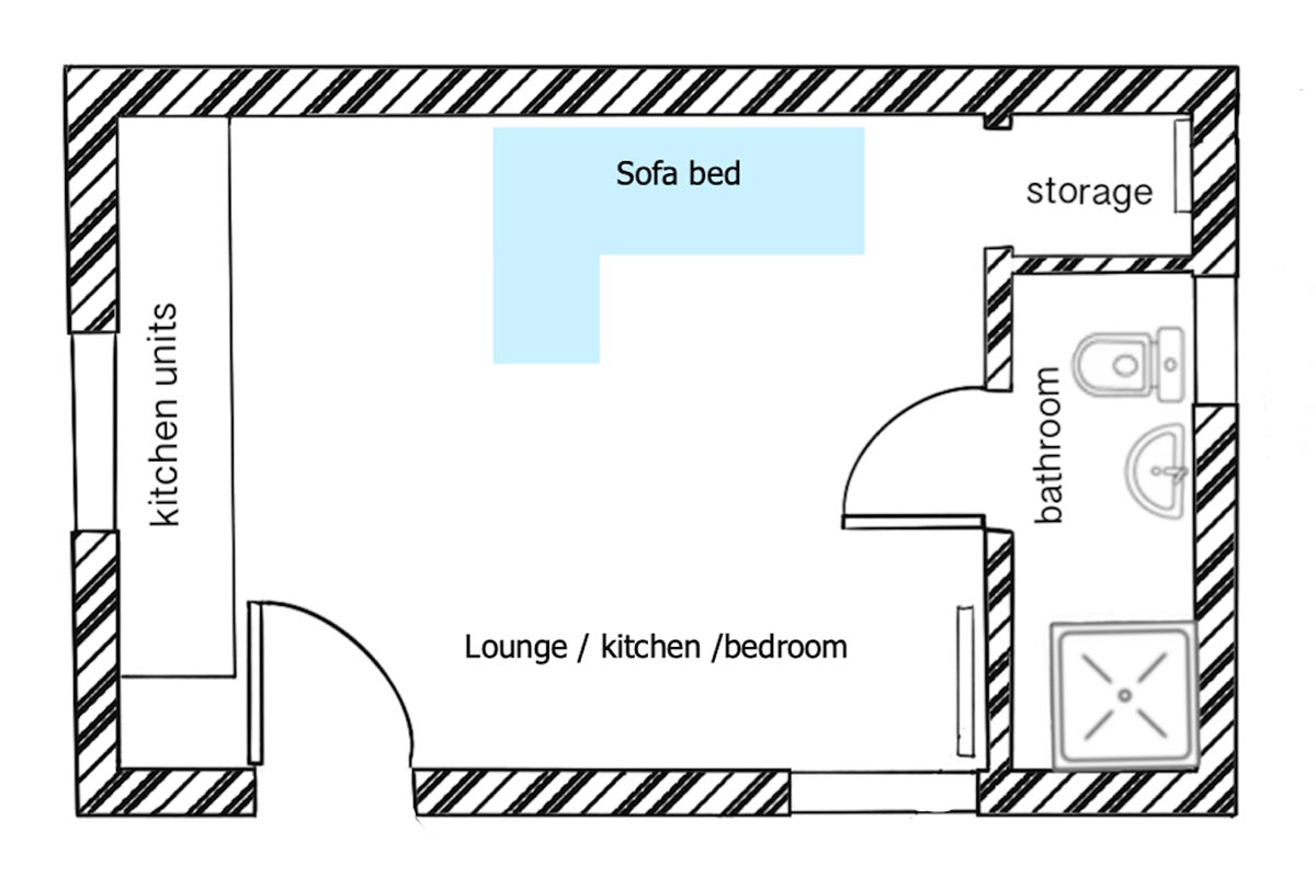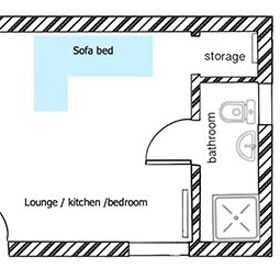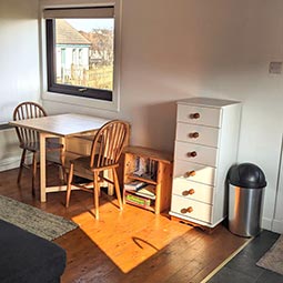 The cabin has a simple layout – it has one living space with a small kitchen area, dining area and a comfortable double sofa bed. There is a small shower-room off the living space. The cabin faces towards the sea, and has views over the rooftops of Shore Street’s cottages to the bay beyond.